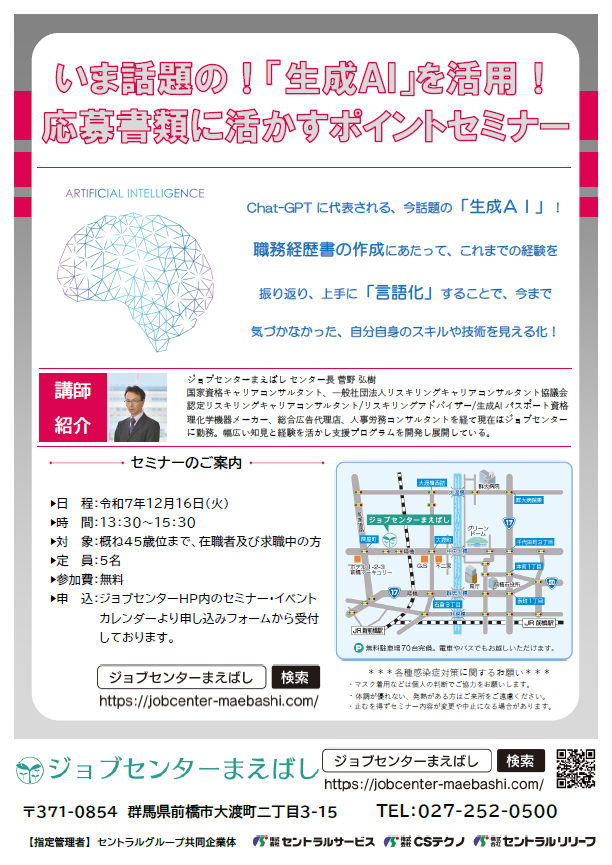 ジョブセンターまえばしでは様々なセミナーイベントが開催されています。