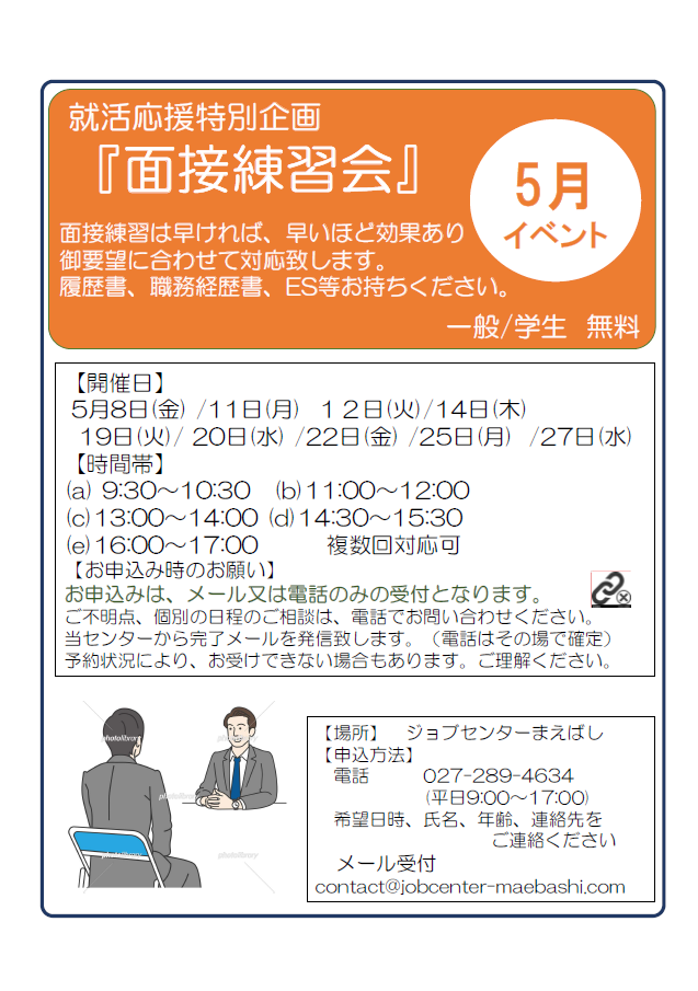 【内容】就活相談/面接練習/履歴書・職務経歴書の書き方について 等