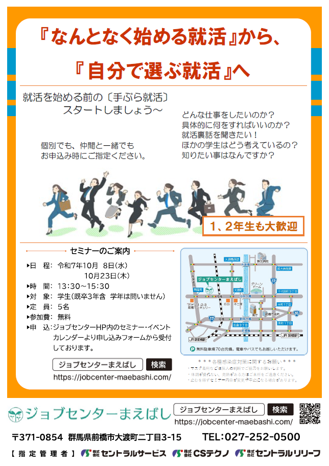 申込み | 開催日の3日前締切。 電話申し込み→ ジョブセンターまえばし総合的就職支援窓口 027-289-4634 までご連絡ください。 HPより申込み→ 下記の参加申し込みフォームから申し込みください。 フォーム入力後イベント申込み完了メールが届きますのでご確認ください。 ※予約確認メールが届かないケースが発生しています。以下をご確認ください。 1.迷惑メールフォルダの確認:当施設のメールが迷惑メールとして振り分けられていないかをご確認ください。 2.受信設定:@jobcenter-maebashi.comを受信許可リストに追加してください。携帯メールアドレスの使用の場合、一般企業からの通信として不自然で、迷惑メール扱いされる場合があります。 |