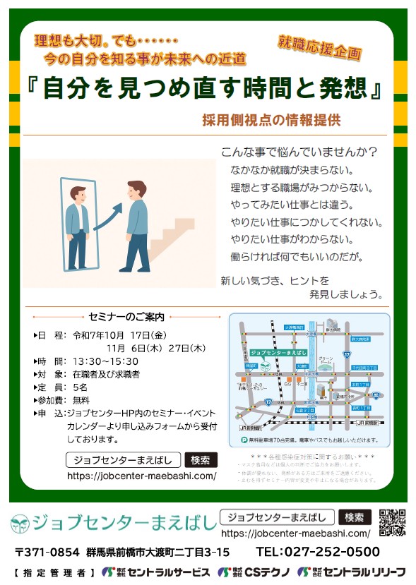 申込み | 開催日の3日前締切。 電話申し込み→ ジョブセンターまえばし総合的就職支援窓口 027-289-4634 までご連絡ください。 HPより申込み→ 下記の参加申し込みフォームから申し込みください。 フォーム入力の際、備考欄に希望の時間とコースを忘れずに入力してください。 フォーム入力後イベント申込み完了メールが届きますのでご確認ください。 ※予約確認メールが届かないケースが発生しています。以下をご確認ください。 1.迷惑メールフォルダの確認:当施設のメールが迷惑メールとして振り分けられていないかをご確認ください。 2.受信設定:@jobcenter-maebashi.comを受信許可リストに追加してください。携帯メールアドレスの使用の場合、一般企業からの通信として不自然で、迷惑メール扱いされる場合があります。 |