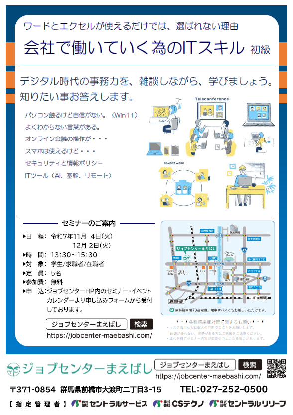 | 申込み | 参加申し込みフォームから申し込み下さい。 フォーム入力後イベント申し込み完了メールが届きますのでご確認ください。 ※予約確認メールが届かないケースが発生しています。以下をご確認ください。 1.迷惑メールフォルダの確認:当施設のメールが迷惑メールとして振り分けられていないかをご確認ください。 2.受信設定:@jobcenter-maebashi.comを受信許可リストに追加してください。携帯メールアドレスの使用の場合、一般企業からの通信として不自然で、迷惑メール扱いされる場合があります。 |