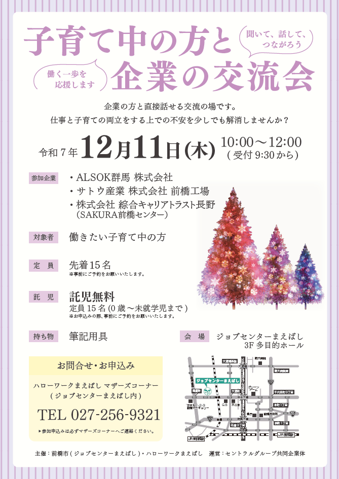 | 申込み | 事前に参加のお申込みが必要です。 本イベントについてのお問い合わせ、お申込みはジョブセンターまえばしハローワーク・マザーズコーナー(TEL:027-256-9321)までご連絡ください。 |