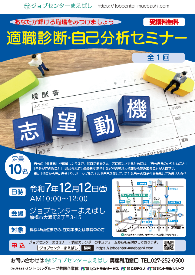 申込み | 参加申し込みフォームから申し込みください。 フォーム入力後イベント申込み完了メールが届きますのでご確認ください。 ※予約確認メールが届かないケースが発生しています。以下をご確認ください。 1.迷惑メールフォルダの確認:当施設のメールが迷惑メールとして振り分けられていないかをご確認ください。 2.受信設定:@jobcenter-maebashi.comを受信許可リストに追加してください。携帯メールアドレスの使用の場合、一般企業からの通信として不自然で、迷惑メール扱いされる場合があります。 |