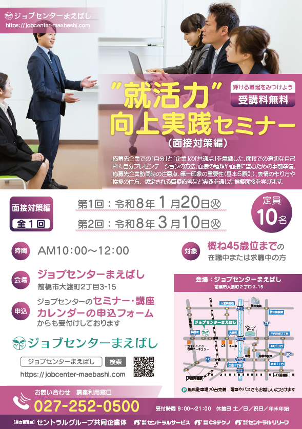 | 申込み | 参加申し込みフォームから申し込みください。 フォーム入力後イベント申込み完了メールが届きますのでご確認ください。 ※予約確認メールが届かないケースが発生しています。以下をご確認ください。 1.迷惑メールフォルダの確認:当施設のメールが迷惑メールとして振り分けられていないかをご確認ください。 2.受信設定:@jobcenter-maebashi.comを受信許可リストに追加してください。携帯メールアドレスの使用の場合、一般企業からの通信として不自然で、迷惑メール扱いされる場合があります。 |