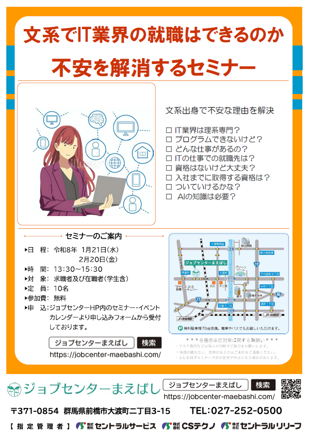 | 申込み | 参加申し込みフォームから申し込みください。 フォーム入力後イベント申込み完了メールが届きますのでご確認ください。 ※予約確認メールが届かないケースが発生しています。以下をご確認ください。 1.迷惑メールフォルダの確認:当施設のメールが迷惑メールとして振り分けられていないかをご確認ください。 2.受信設定:@jobcenter-maebashi.comを受信許可リストに追加してください。携帯メールアドレスの使用の場合、一般企業からの通信として不自然で、迷惑メール扱いされる場合があります。 |