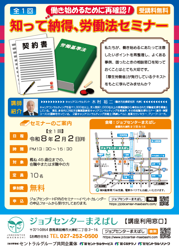 | 申込み | 参加申し込みフォームから申し込みください。 フォーム入力後イベント申込み完了メールが届きますのでご確認ください。 ※予約確認メールが届かないケースが発生しています。以下をご確認ください。 1.迷惑メールフォルダの確認:当施設のメールが迷惑メールとして振り分けられていないかをご確認ください。 2.受信設定:@jobcenter-maebashi.comを受信許可リストに追加してください。携帯メールアドレスの使用の場合、一般企業からの通信として不自然で、迷惑メール扱いされる場合があります。 |