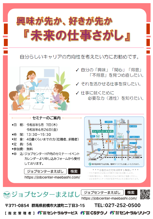| 申込み | 参加申し込みフォームから申し込み下さい。 フォーム入力後イベント申し込み完了メールが届きますのでご確認ください。 ※予約確認メールが届かないケースが発生しています。以下をご確認ください。 1.迷惑メールフォルダの確認:当施設のメールが迷惑メールとして振り分けられていないかをご確認ください。 2.受信設定:@jobcenter-maebashi.comを受信許可リストに追加してください。携帯メールアドレスの使用の場合、一般企業からの通信として不自然で、迷惑メール扱いされる場合があります。 |